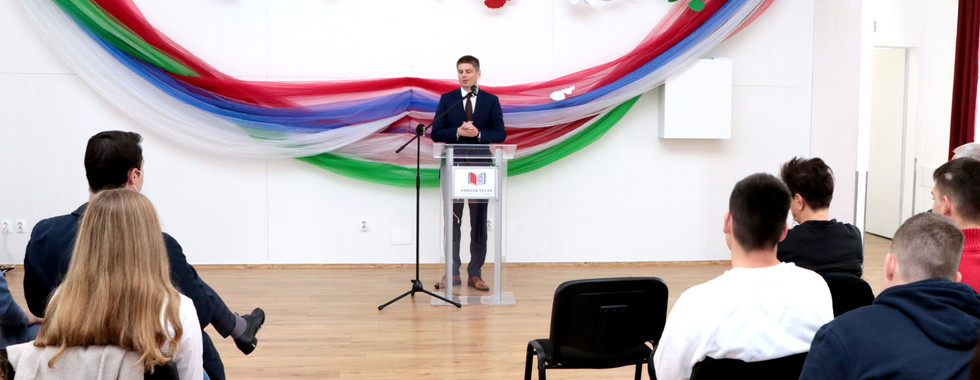 Испред школске зграде уваженог госта дочекала је директорка др Јованка Ластић. По древном словенском обичају ђаци обучени у живописну народну ношњу Арноа Гујона и Ивана Тодорова, амбасадора Републике Србије у Будимпешти дочекали су хлебом и сољу. У препуној свечаној сали цењеног госта аплаузом дочекали су ученици и професори наше гимназије. На самом почетку госта је поздравио гимназијски женски хор. Прелепо обучене девојке овом приликом су под диригенстком палицом професорке Оливере Мунишић извеле две народне песме: „Киша пада, трава расте” и „У Будиму граду”. Потом је Лена Ембер, ученица 11/а разреда веома дирљиво отпевала песму „Косовка девојка”. После њене соло-песме уследио је наступ фолклорне групе ђака виших разреда наше основе школе на Тргу ружа. Вешти ученици су овај пут извели сплет кола из Шумадије.